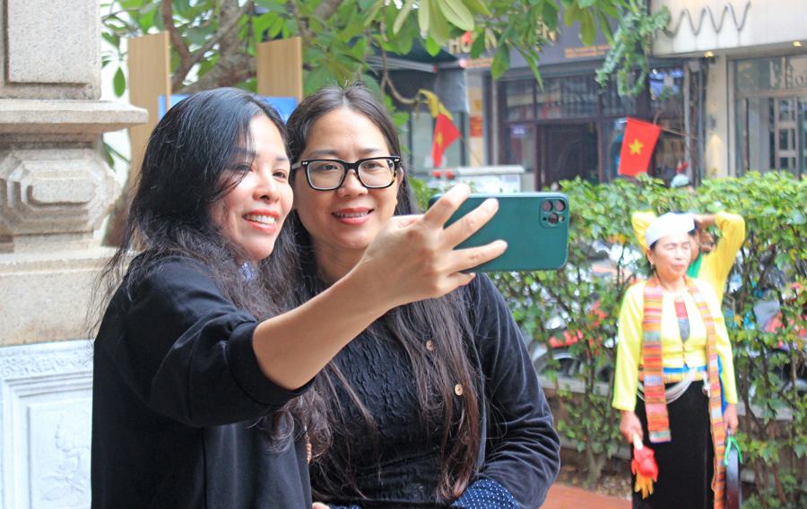 Bà Nguyễn Thị Thuyết (bìa trái) check-in với khung cảnh đồng bào Mường. Ảnh: TITC
