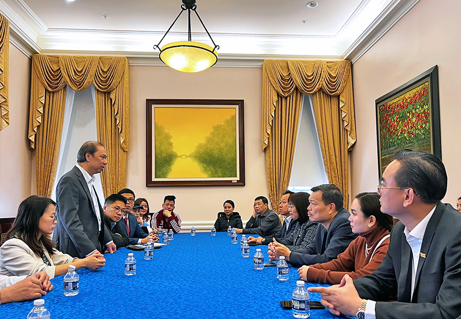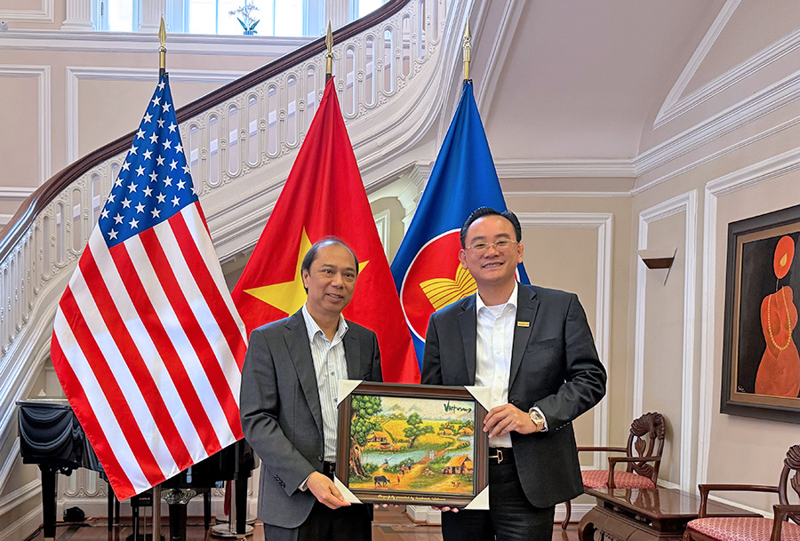 Đại diện doanh nghiệp du lịch Việt Nam tặng quà lưu niệm Đại sứ đặc mệnh toàn quyền Việt Nam tại Hoa Kỳ Nguyễn Quốc Dũng