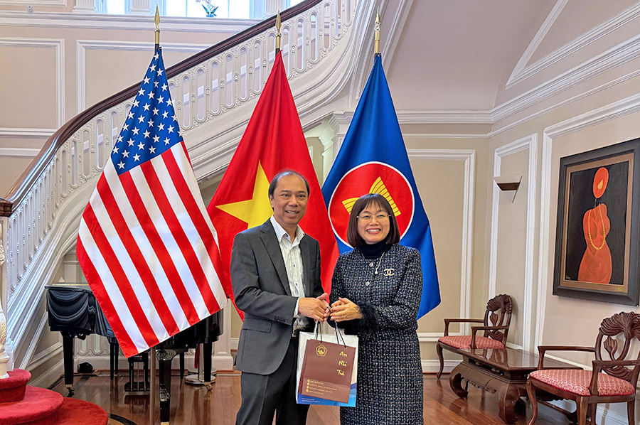Phó Cục trưởng Nguyễn Thị Hoa Mai tặng quà lưu niệm Đại sứ đặc mệnh toàn quyền Việt Nam tại Hoa Kỳ Nguyễn Quốc Dũng