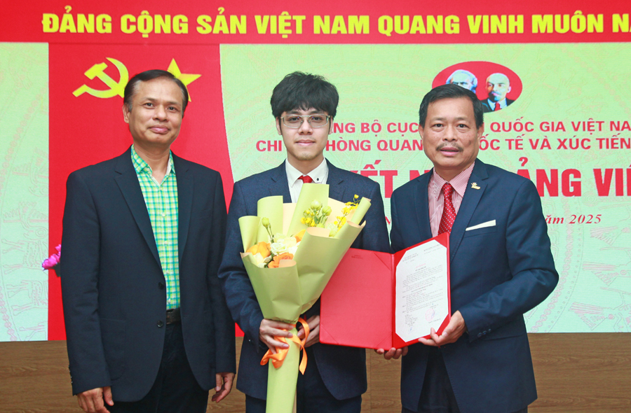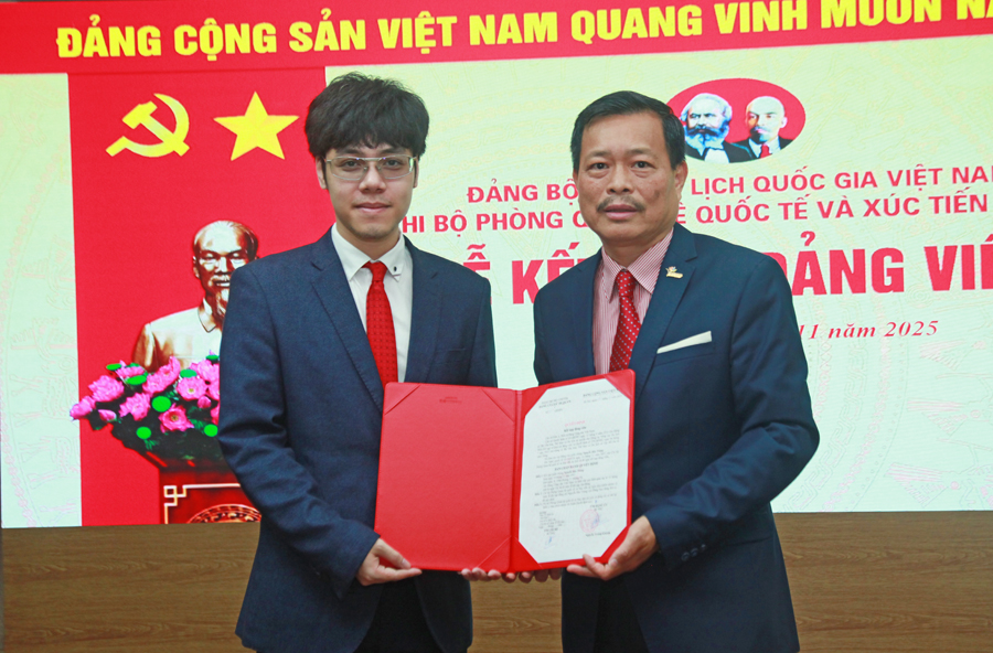 Bí thư Chi bộ Phòng Quan hệ quốc tế và Xúc tiến du lịch Nguyễn Quý Phương trao Quyết định kết nạp đảng cho đồng chí Nguyễn Bảo Trung. Ảnh: TITC