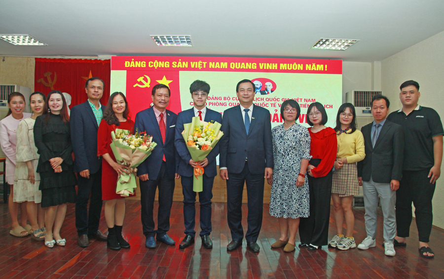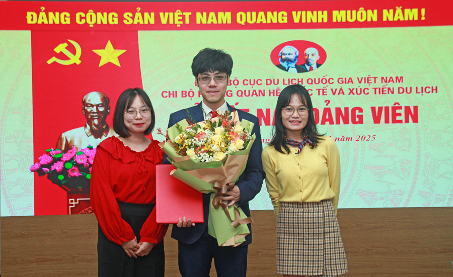 Đại diện Chi bộ Phòng Quan hệ quốc tế và Xúc tiến du lịch cùng Đoàn Thanh niên tặng hoa chúc mừng đồng chí Nguyễn Bảo Trung. Ảnh: TITC