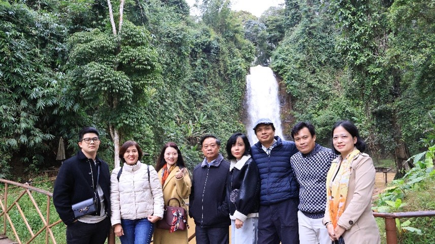 Đoàn khảo sát thắng cảnh tự nhiên nổi tiếng thác Pa Sỹ, Măng Đen. Ảnh: TITC