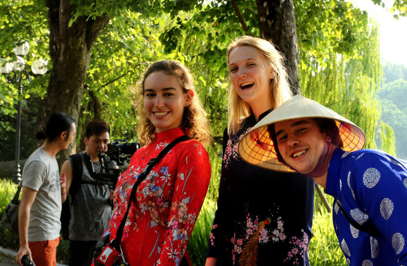 Du khách nước ngoài duyên dáng trong tà áo dài Việt. Ảnh: Dương Văn Tăng