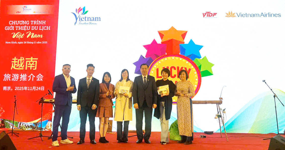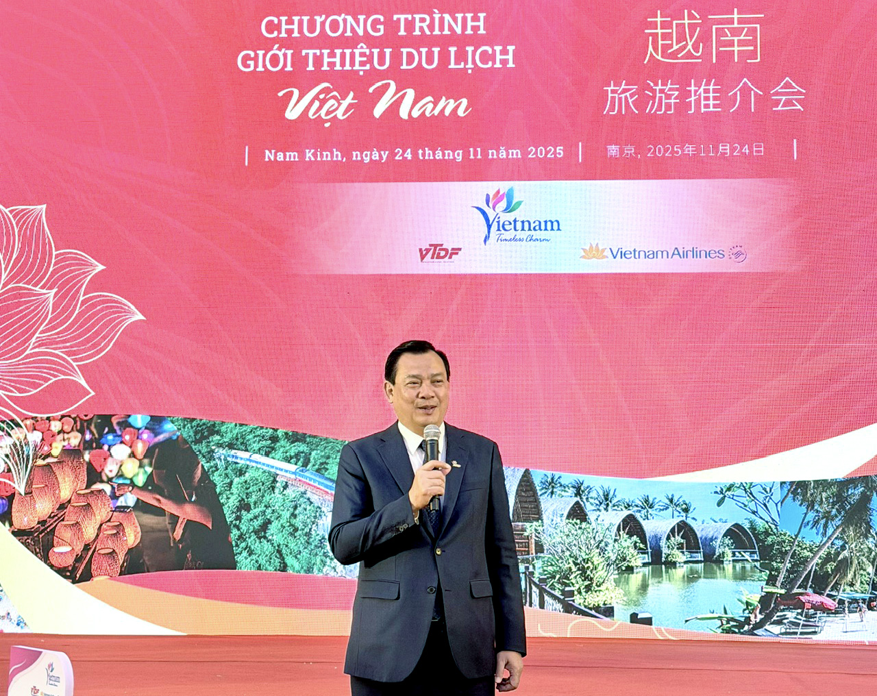 (TITC) - Tối ngày 24/11 theo giờ địa phương, tiếp nối chuỗi sự kiện xúc tiến du lịch tại Trung Quốc lần thứ hai trong năm 2025, Cục trưởng Cục Du lịch Quốc gia Việt Nam Nguyễn Trùng Khánh dẫn đầu đoàn công tác tổ chức Chương trình giới thiệu du lịch Việt Nam tại thành phố Nam Kinh, tỉnh Giang Tô.