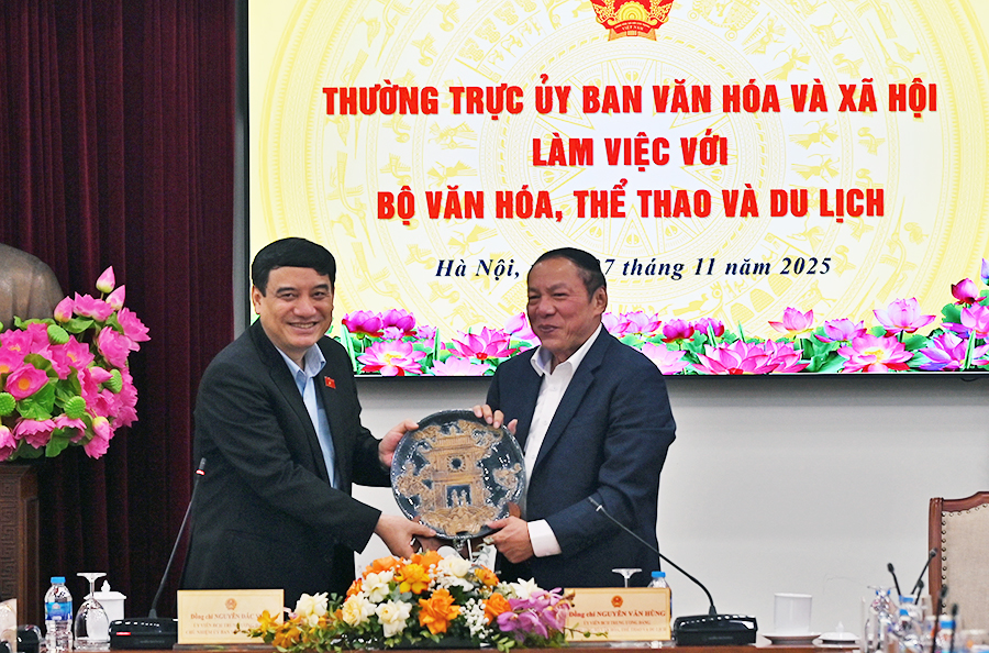 (TITC) - Chiều ngày 27/11, tại Hà Nội, Thường trực Uỷ ban Văn hoá và Xã hội (VHXH) của Quốc hội đã làm việc với Bộ VHTTDL về kết quả thực hiện nhiệm vụ năm 2025, kế hoạch công tác năm 2026 và đánh giá nhiệm vụ giai đoạn 2021-2025. Uỷ viên BCH Trung ương Đảng, Bộ trưởng Bộ VHTTDL Nguyễn Văn Hùng và Uỷ viên BCH Trung ương Đảng, Chủ nhiệm Uỷ ban VHXH Nguyễn Đắc Vinh đồng chủ trì buổi làm việc.