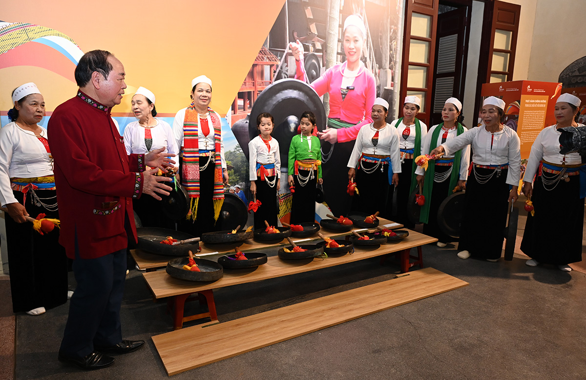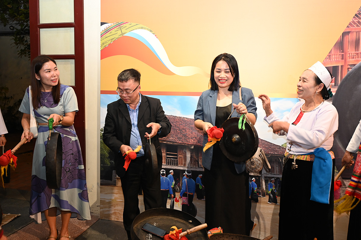 Tại không gian trưng bày, các đại biểu đã lắng nghe Giám đốc Bảo tàng Di sản Văn hóa Mường Bùi Thanh Bình và TS. An Thu Trà - giám tuyển trưng bày - giới thiệu về các hiện vật, những câu chuyện về nỗ lực bảo tồn di sản, kỹ năng biểu diễn Chiêng, Nhạc Ngũ âm, văn hóa ẩm thực đặc trưng…