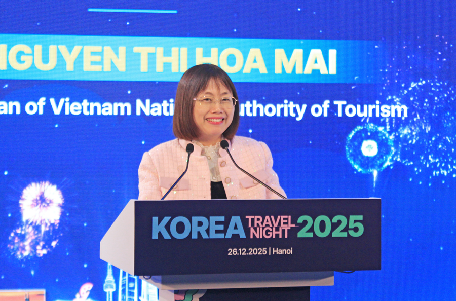 (TITC) - Tối ngày 26/12, tại Hà Nội, Văn phòng Cục Du lịch Hàn Quốc tại Việt Nam tổ chức sự kiện “Đêm Du lịch Hàn Quốc 2025”, nhằm tri ân và vinh danh các đối tác đã đồng hành, đóng góp tích cực vào sự phát triển của du lịch Hàn Quốc tại thị trường Việt Nam trong năm 2025. Phó Cục trưởng Cục Du lịch Quốc gia Việt Nam Nguyễn Thị Hoa Mai đã tham dự và có bài phát biểu tại sự kiện. Sự kiện còn có sự tham gia của nhiều doanh nghiệp du lịch, cơ quan quản lý, các hiệp hội du lịch, hãng hàng không…