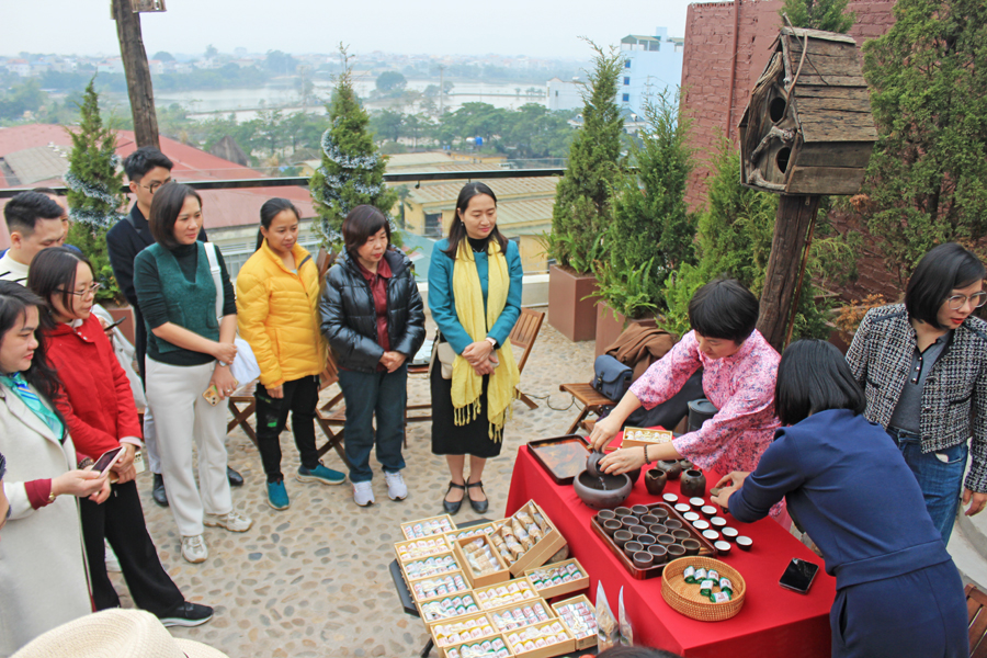 Đại biểu trải nghiệm tour “Đánh thức” tại xã Vân Đình, nghe giới thiệu về trà Trấn Thị. Ảnh: TITC