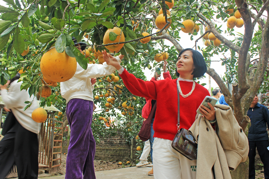 Đại biểu check-in, tham quan vườn bưởi, nghe hát chèo làng chài. Ảnh: TITC