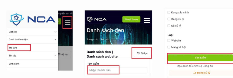 Sau khi truy cập vào trang, người dùng chọn tính năng tra cứu, click vào bộ lọc, nhập tên miền và nhấn tìm kiếm để nhận thông tin về độ tin cậy của trang web.