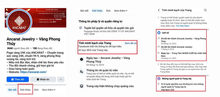 Người dùng cần chú ý đến thông tin lịch sử đổi tên trang và vị trí quốc gia/khu vực người quản lý trang đăng nhập. Hầu hết các tài khoản giả mạo đều mới được thành lập hoặc mới được đổi tên và đăng bài quảng cáo trong thời gian ngắn, có đăng nhập bên ngoài lãnh thổ Việt Nam.