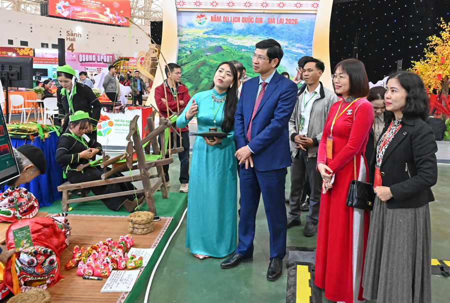 Thứ trưởng Bộ VHTTDL Hồ An Phong và Phó Cục trưởng Cục Du lịch Quốc gia Việt Nam Nguyễn Thị Hoa Mai thăm gian hàng Lạng Sơn. Ảnh:TITC