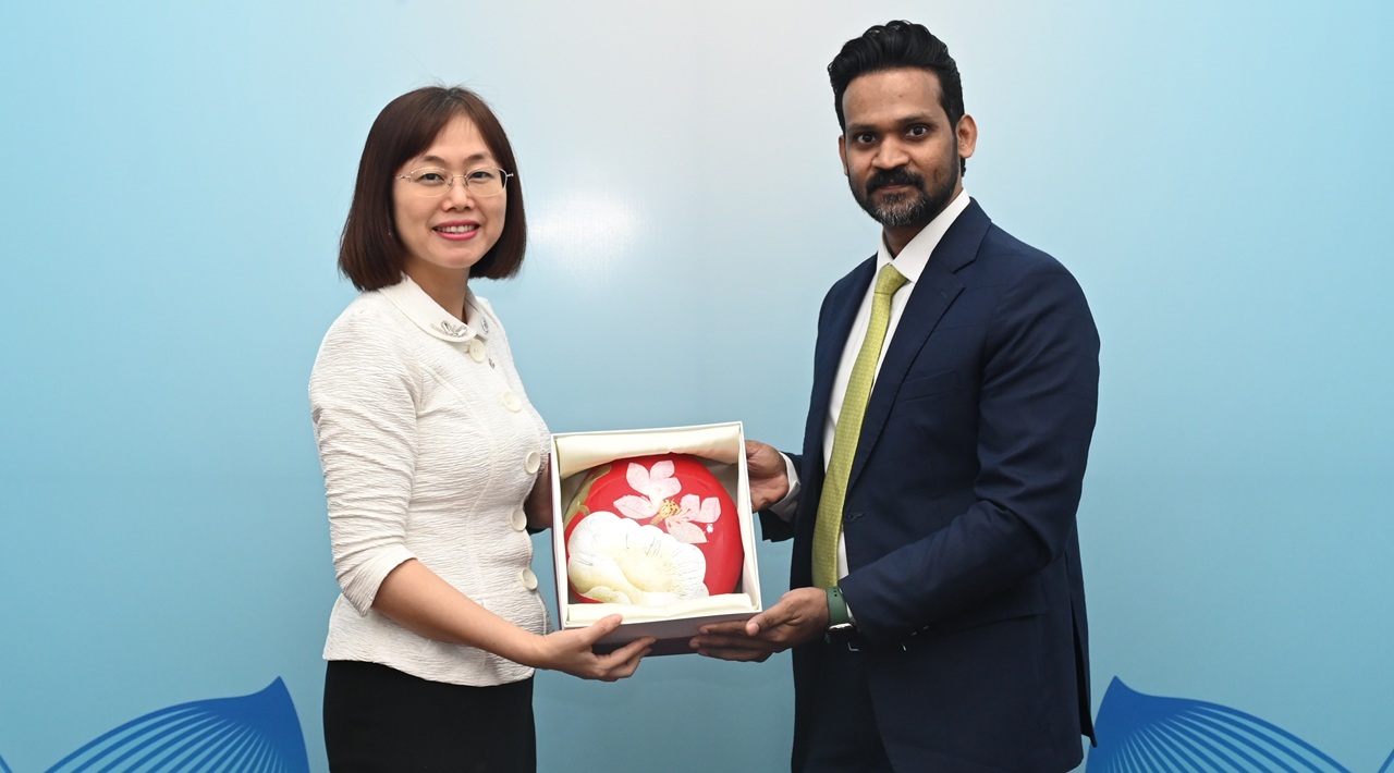 Phó Cục trưởng Cục Du lịch Quốc gia Việt Nam Nguyễn Thị Hoa Mai tặng quà lưu niệm cho ông Shrishen Muniandy, Giám đốc quốc gia Công ty VFS Global. Ảnh: TITC