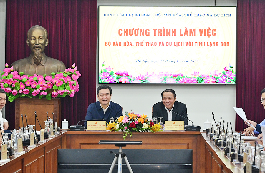 (TITC) - Chiều ngày 12/12, tại Hà Nội, Uỷ viên BCH Trung ương Đảng, Bộ trưởng Bộ VHTTDL Nguyễn Văn Hùng đã có buổi tiếp và làm việc với đoàn công tác UBND tỉnh Lạng Sơn do Phó Bí thư Tỉnh ủy, Chủ tịch UBND tỉnh Lạng Sơn Nguyễn Cảnh Toàn làm trưởng đoàn. Cùng dự còn có lãnh đạo các Cục, Vụ, đơn vị thuộc Bộ VHTTDL.