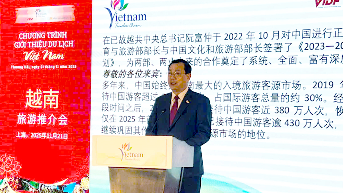 (TITC) - Tối ngày 21/11 theo giờ địa phương, tại thành phố Thượng Hải (Trung Quốc), Cục trưởng Cục Du lịch Quốc gia Việt Nam Nguyễn Trùng Khánh dẫn đầu đoàn công tác Việt Nam tổ chức Chương trình Giới thiệu du lịch Việt Nam, kết nối doanh nghiệp - sự kiện mở màn cho chuỗi hoạt động xúc tiến du lịch Việt Nam tại Trung Quốc lần thứ hai năm 2025.